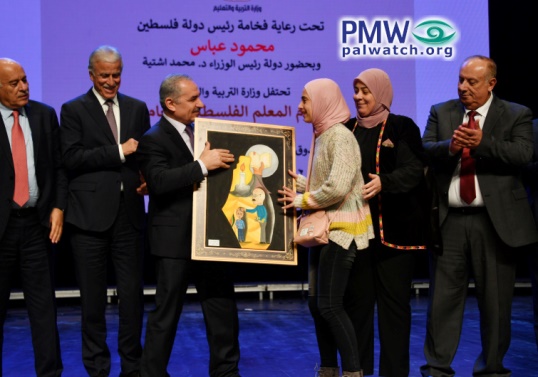 The painting shows a teacher inside the map of “Palestine” holding a book with the Palestinian flag while building a boy out of puzzle pieces.